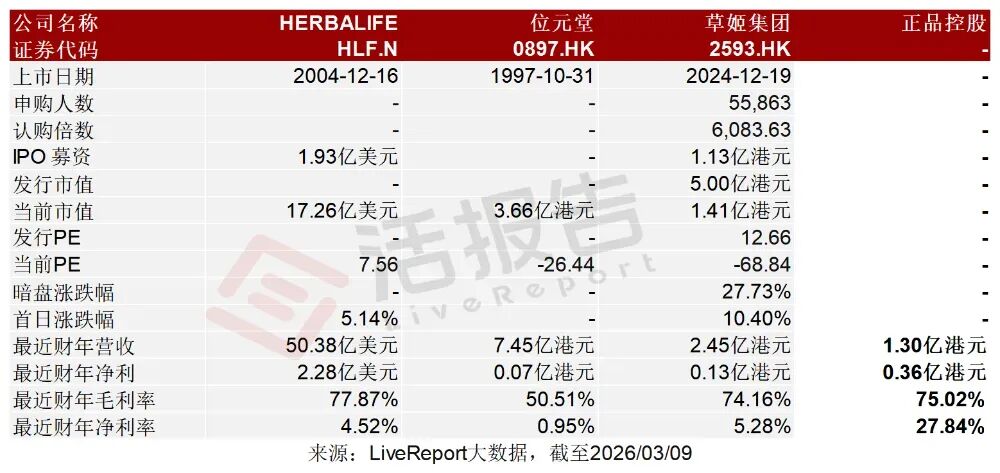 同行业IPO可比公司:HERBALIFE(HLF.N)、位元堂(0897.HK)、草姬集团(2593.HK)。