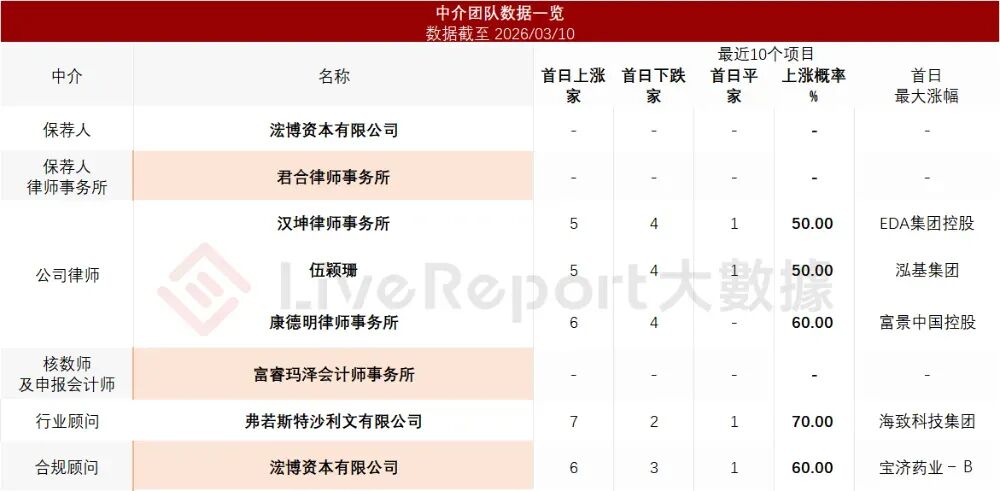 据LiveReport大数据统计,正品控股中介团队共计8家,其中保荐人1家;公司律师共计3家,综合项目数据表现不足。整体而言中介团队历史数据表现有待提升。