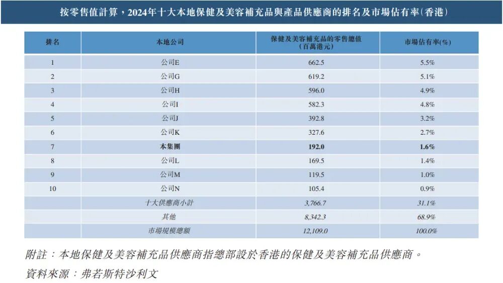 公司将产品的生产外包给供应商(包括制造商)并主要透过万宁在香港的零售门市以公司自有品牌及第三方品牌分销公司的产品。根据弗若斯特沙利文的资料,按保健及美容补充品与产品的零售值计算,公司于2024年在香港所有国际及本地保健及美容补充品与产品供应商中的市场占有率约为1.6%。