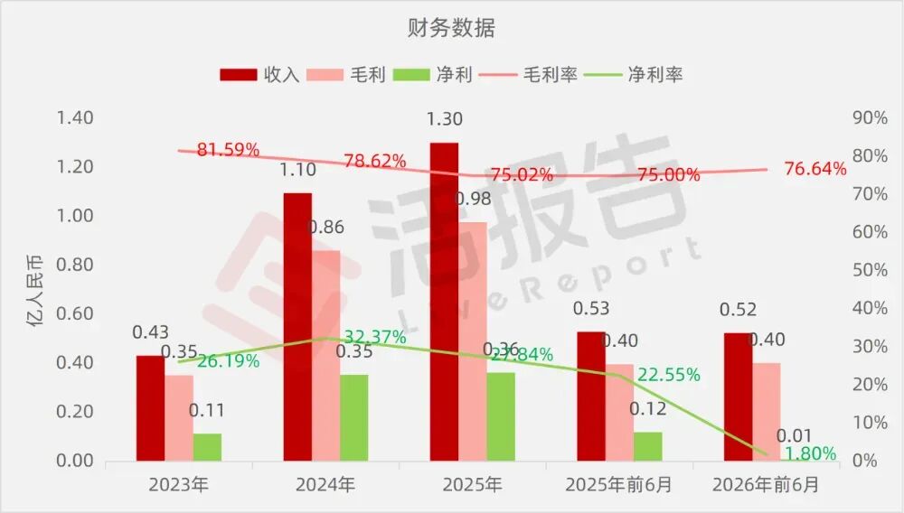 收入分别约为人民币0.43亿、1.10亿、1.30亿、0.53亿、0.52亿,2026年前6月同比-1.03%;